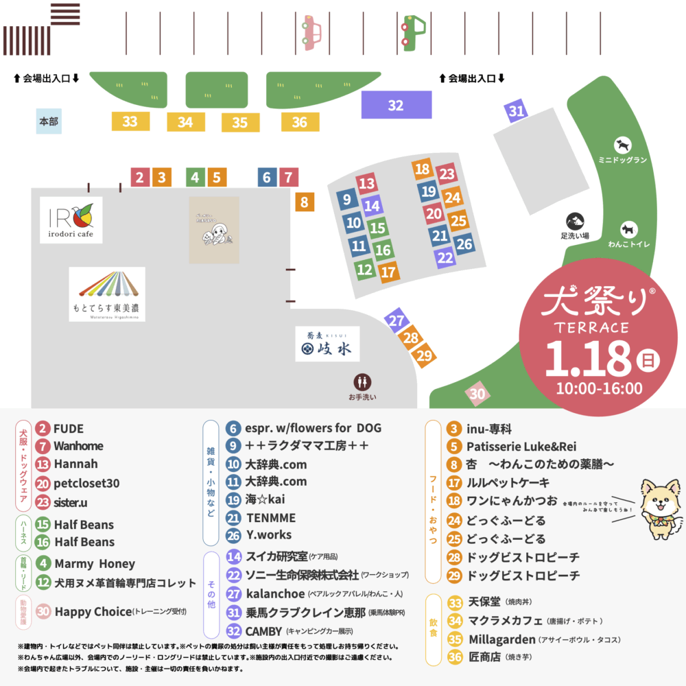 2026年1月18日(日)犬祭りテラス出店一覧 2025年12月5日 最終更新日時 : 2026年1月10日 inumatsuri 犬祭りテラス 約35ブースが出店! GUIDE MAP当日のレイアウトはこちら ダウンロードはこちら PICK UPピックアップ 犬祭り初出店 SHOP LISTショップリスト 日付は出店日になります。 キッチンカー